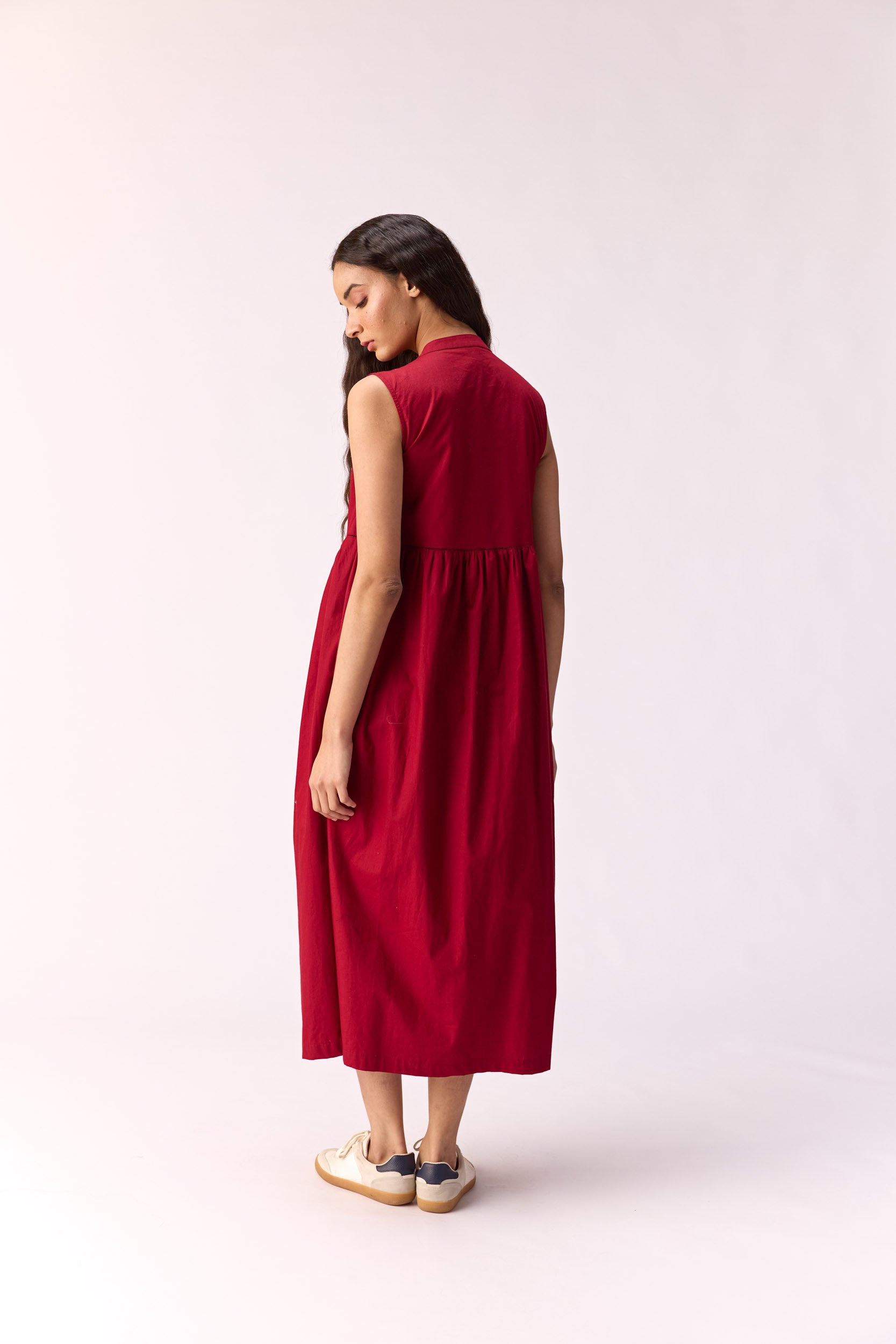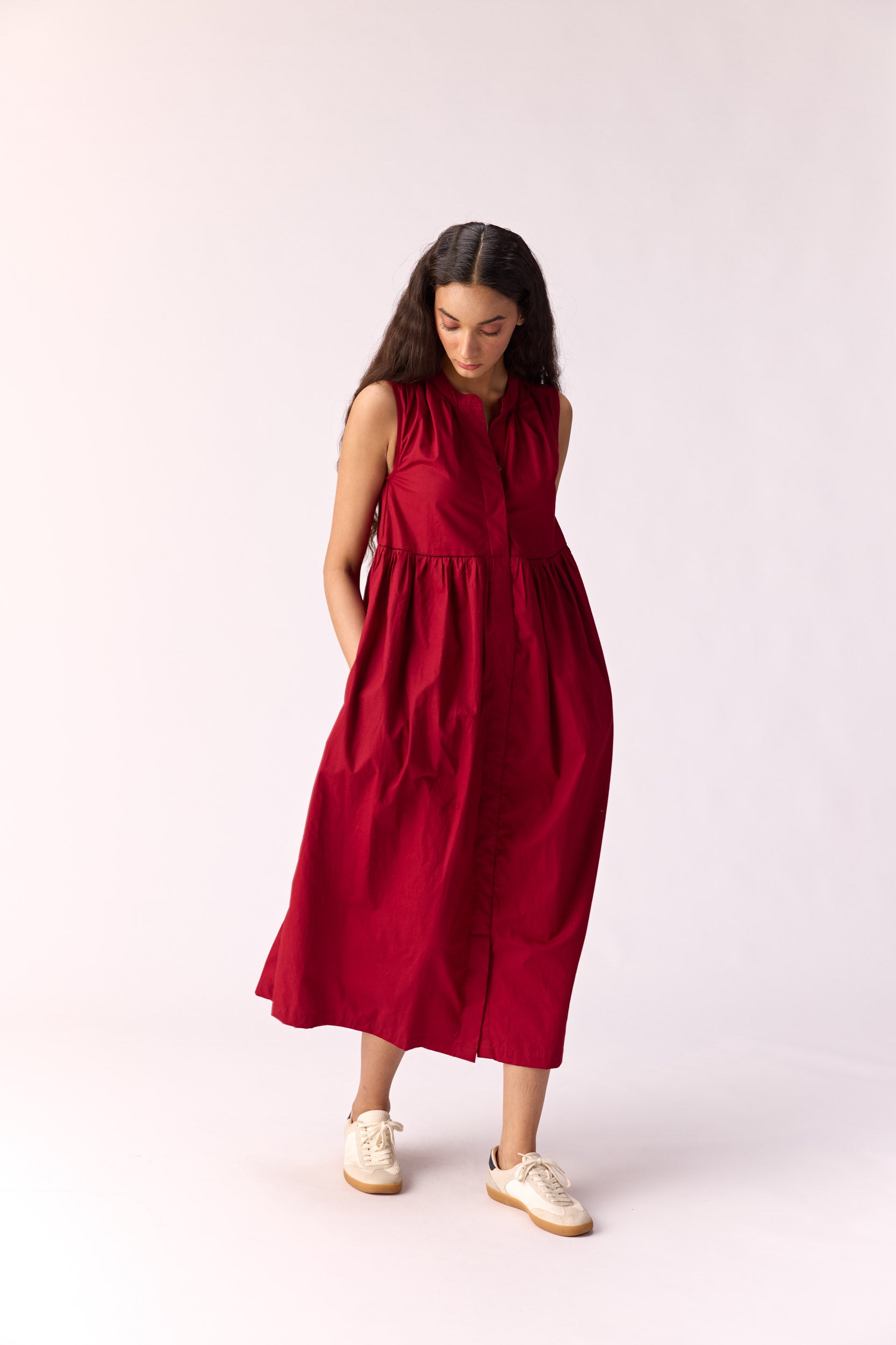 A stunning raspberry red sleeveless button down dress with soft gathers around the waist. A button down placket and side pockets makes this one a staple.