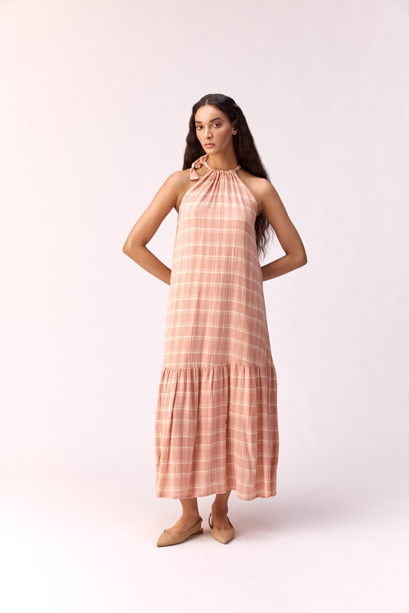 A checkered neck tie up longline dress.. Soft gathers around the neckline and hemline. Side pockets. Crafted in self stripe soft cotton.